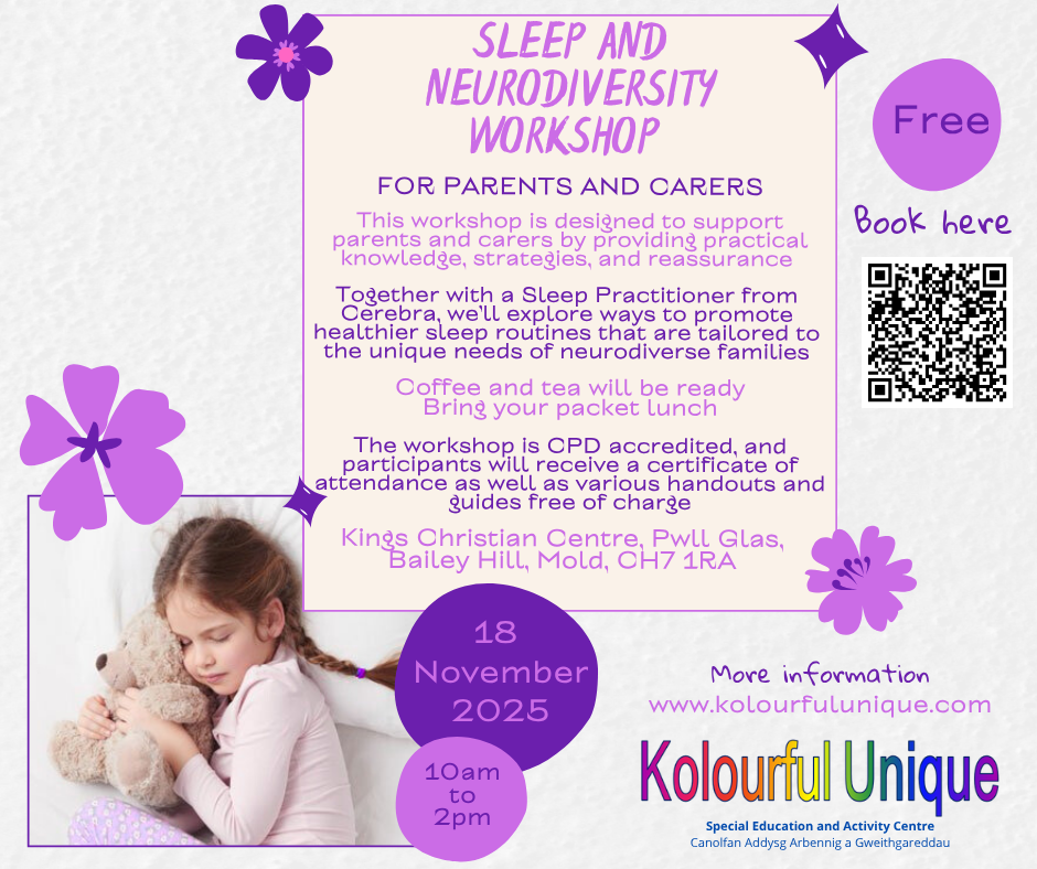 Sleep and Neurodiversity. This workshop will be led by a sleep practitioner from Cerebra and is designed to support parents and carers by providing practical knowledge, strategies, and reassurance. Together with our guest speaker, we’ll explore ways to promote healthier sleep routines that are tailored to the unique needs of neurodiverse families. The workshop is CPD accredited, and participants will receive a certificate of attendance as well as various handouts and guides free of charge. You will learn why sleep can be different for autistic children, ADHDers, and others with neurodiverse profiles, the impact of sleep on learning, behaviour, and emotional well-being, common barriers to sleep: sensory sensitivities, anxiety, routines, and body clock differences, practical strategies and sleep-friendly environments, tools that can help-from visual supports to calming bedtime routines, and where to go for further help and professional support. Coffee and tea will be ready. Bring your own packet lunch. No fees.