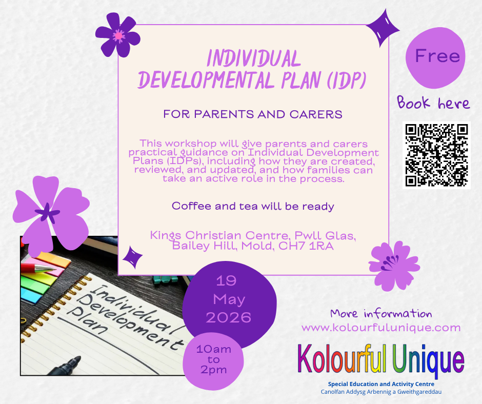 Individual Developmental Plan (IDP) for parents and carers This workshop will give parents and carers practical guidance on Individual Development Plans (IDPs), including how they are created, reviewed, and updated, and how families can take an active role in the process. Coffee and tea will be ready, no fees, a donation towards the cost would be appreciated .